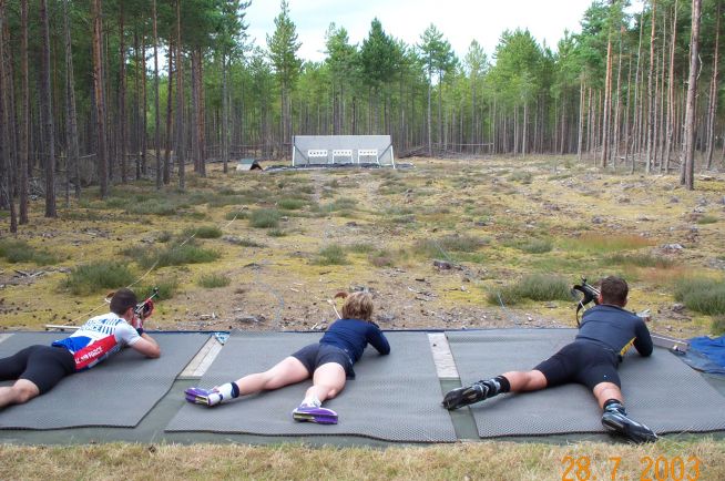 Perhaps the most obvious and colourful combination for easy access to the biathlon experience is laser biathlon rifles and rollerskiing (check www.rollerski.co.uk), but there are many others and the only limit is the imagination. We’ve used: rowing machines and military SAT ranges; BMX bicycles and air rifles; and even simple ‘gym circuit’ exercises with AirSoft rifles.